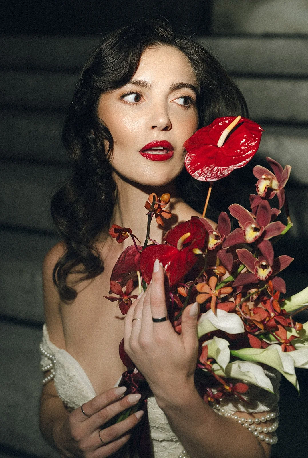 Delicate magic, these bouquets are usually made with a single - two flower variety giving you breathtaking simplicity. Examples like Anthuriums, Calla lilies, Roses. With cascading ribbon or wrap.
