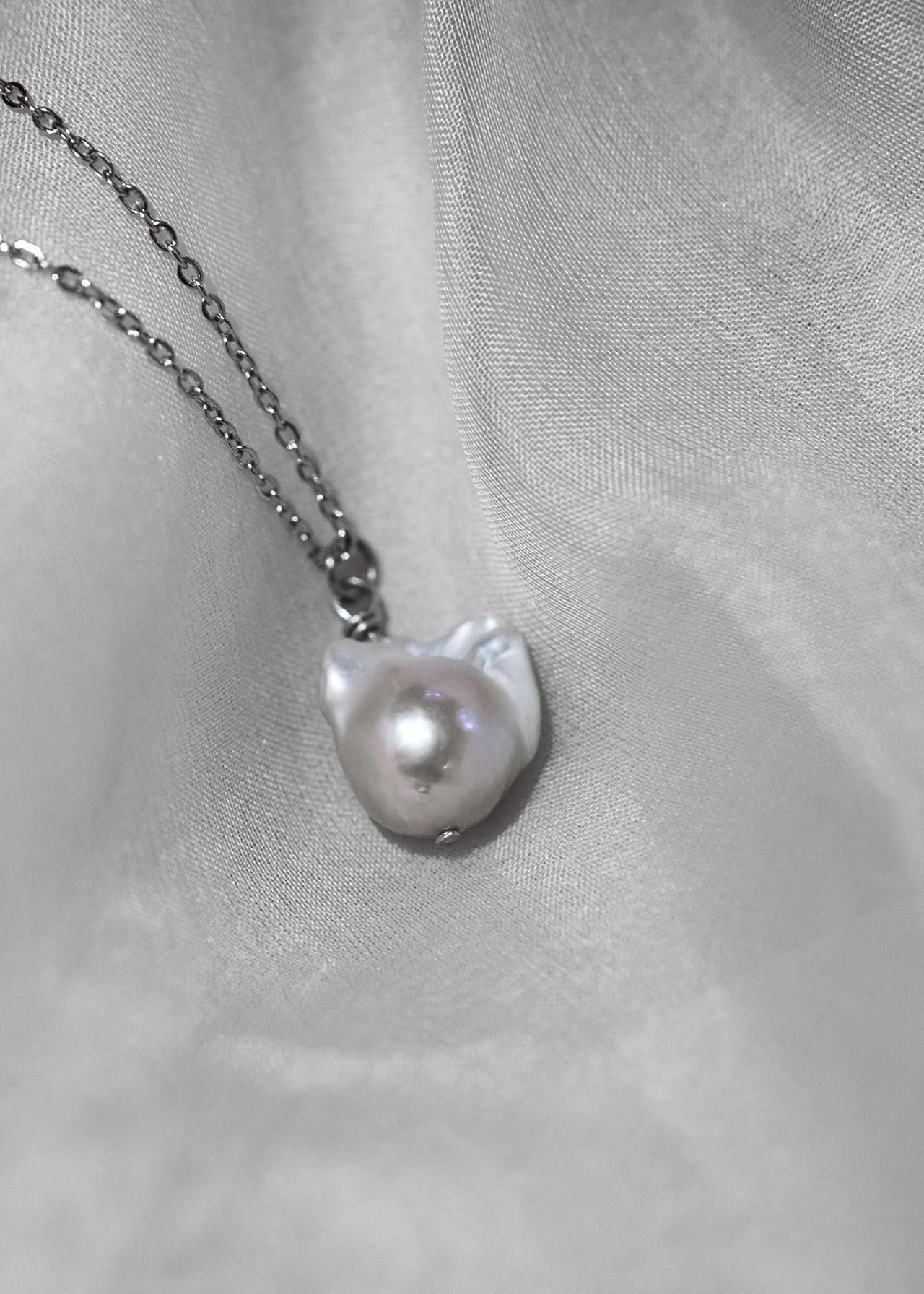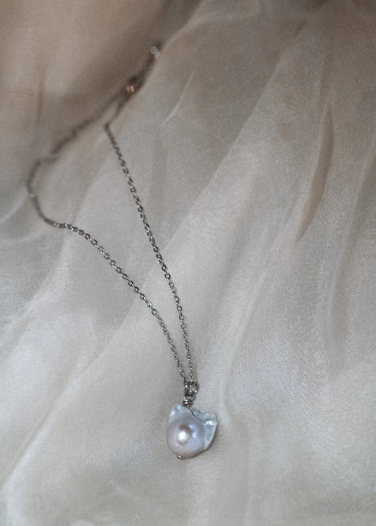 A stunning and dainty high luster Grey Flameball Pearl necklace. Featured on 16” stainless steel chain.